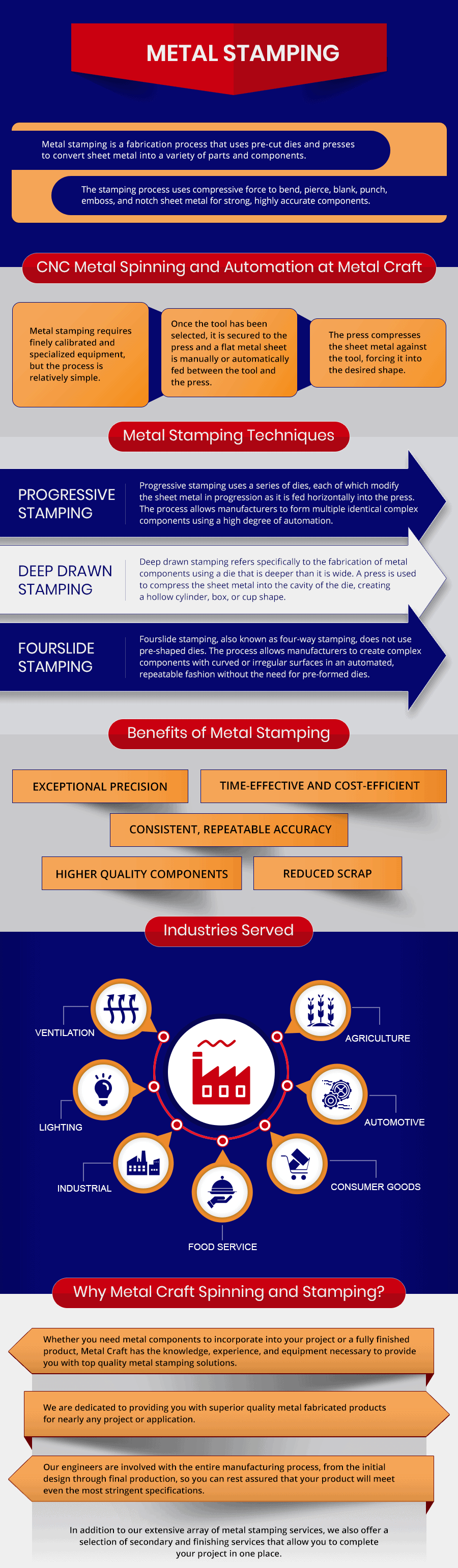 Metal stamping is a fabrication process that uses pre-cut dies and presses to convert sheet metal into a variety of parts and components. The stamping process uses compressive force to bend, pierce, blank, punch, emboss, and notch sheet metal for strong, highly accurate components ideal for agricultural, automotive, food service, lighting, ventilation, and industrial applications. Stamping is also invaluable for the manufacture of a range of consumer goods, including satellite dishes, vacuum cleaners, flag stands, fireplace accessories, funeral urns, and custom display stands, among many others.